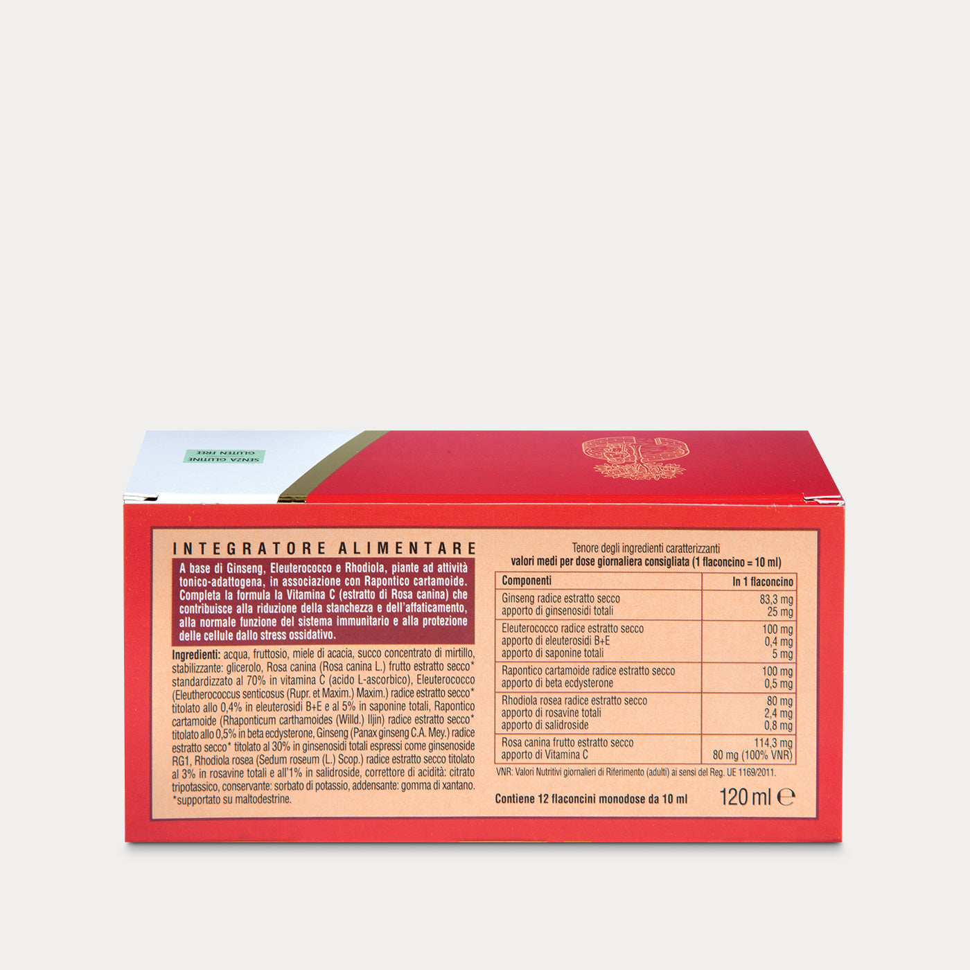 Integratore alimentare a base di Ginseng, Eleuterococco e Rhodiola, piante ad attività tonico-adattogena, in associazione con Rapontico cartamoide. Completa la formula la Vitamina C (estratto di Rosa canina) che contribuisce alla riduzione della stanchezza e dell’affaticamento, alla normale funzione del sistema immunitario e alla protezione delle cellule dallo stress ossidativo.