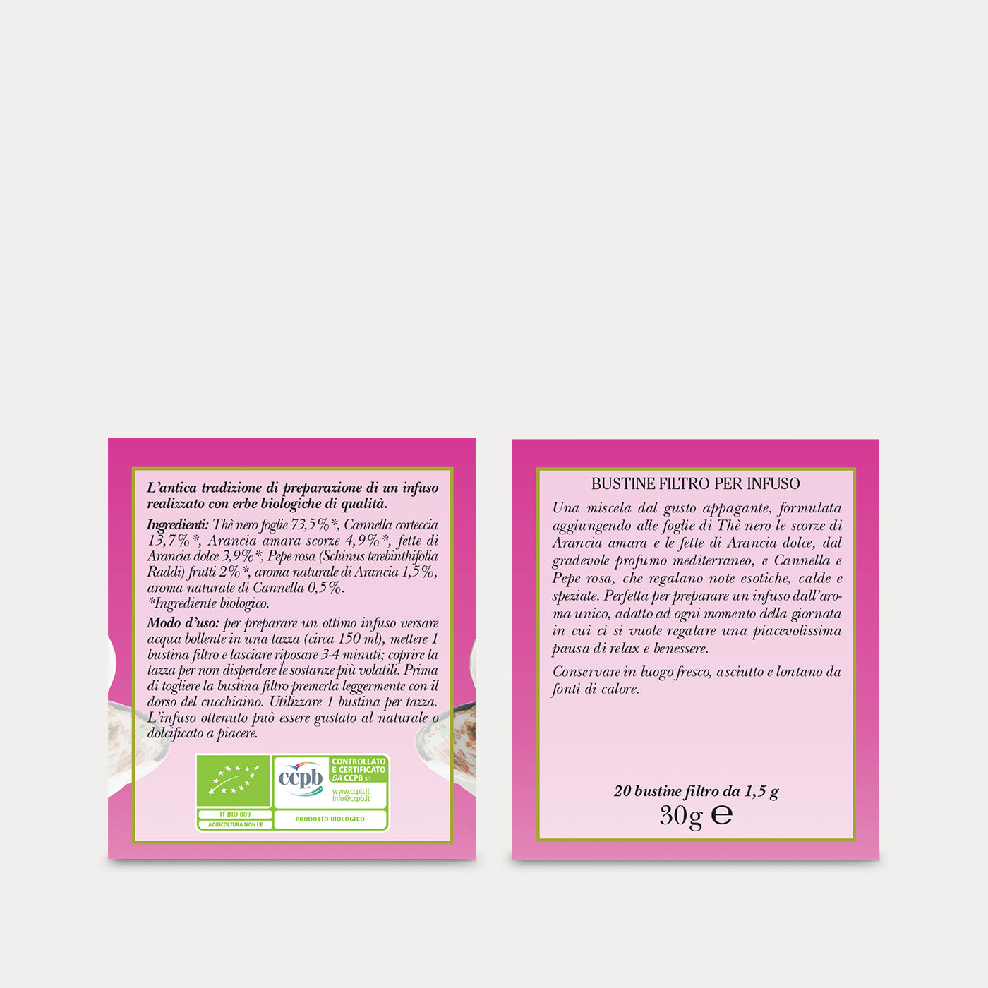 Una miscela dal gusto appagante, formulata aggiungendo alle foglie di Thè nero le scorze di Arancio amaro e le fette di Arancia dolce, dal gradevole profumo mediterraneo, e Cannella e Pepe rosa, che regalano note esotiche, calde e speziate.