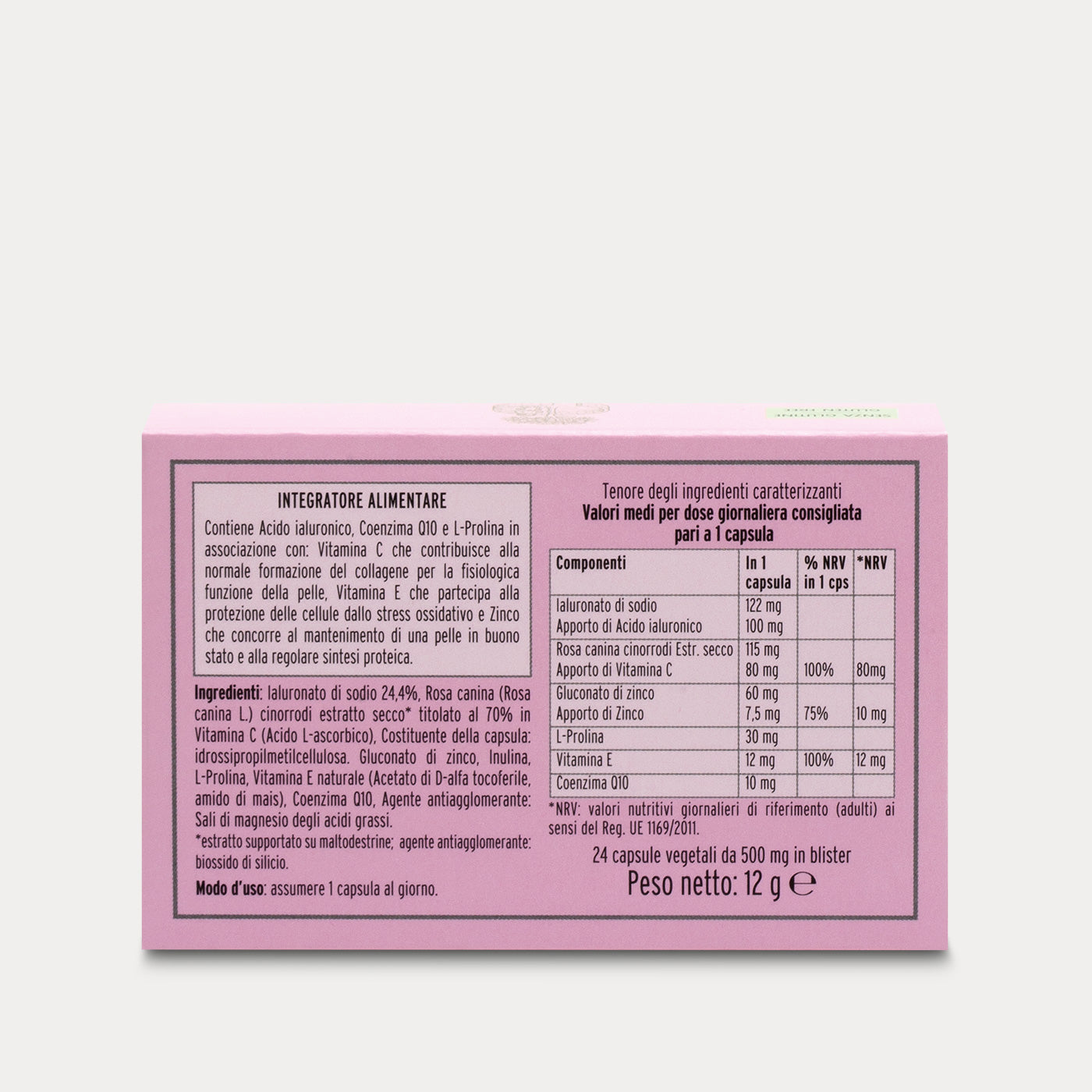 Questo integratore contiene Acido ialuronico di origine vegetale, Coenzima Q10 e L-Prolina in associazione con: Vitamina C che contribuisce alla normale formazione del collagene per la fisiologica funzione della pelle, Vitamina E che partecipa alla protezione delle cellule dallo stress ossidativo e Zinco che concorre al mantenimento di una pelle in buono stato e alla regolare sintesi proteica.