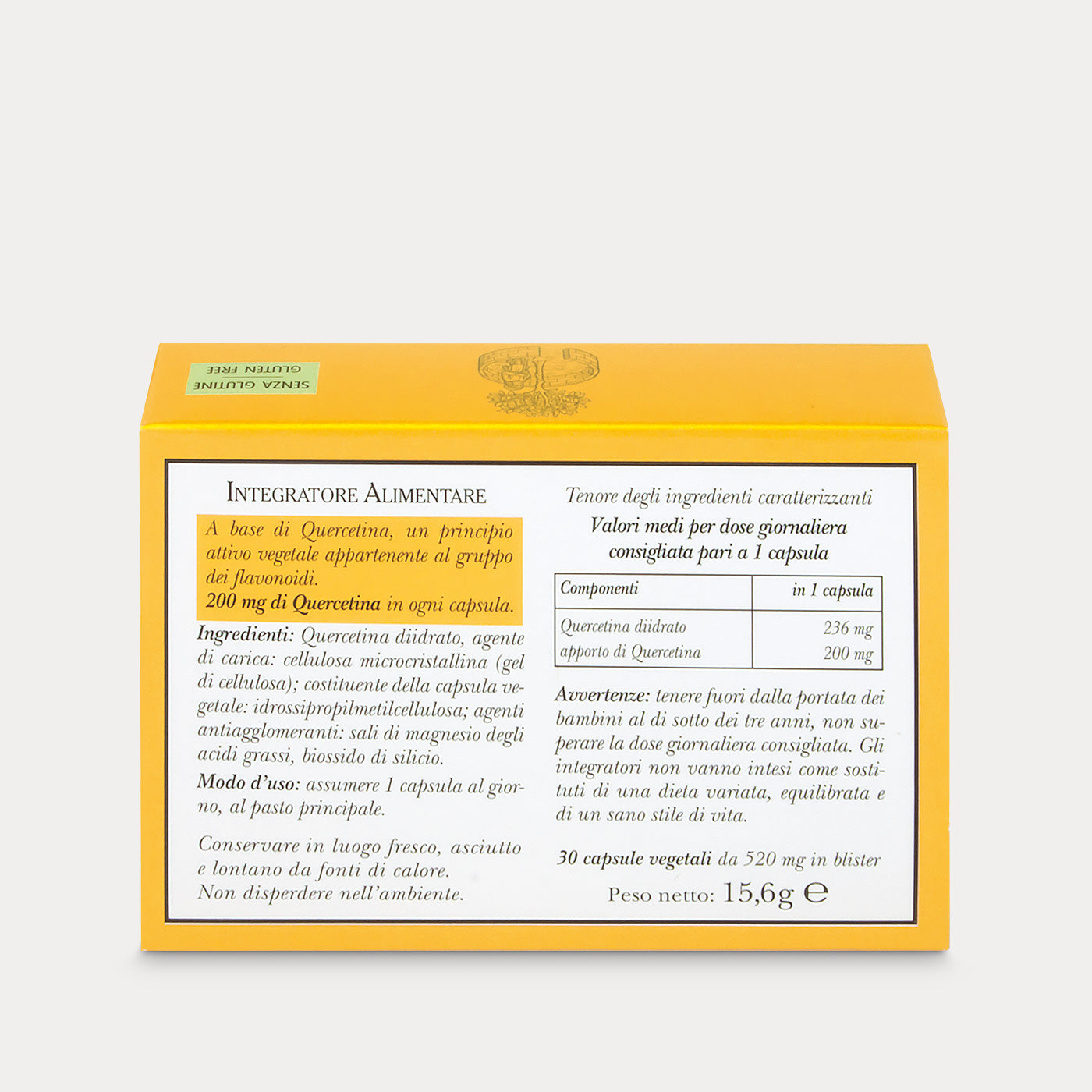 La Quercetina è un principio attivo naturale che appartiene alla famiglia dei flavonoidi, sostanze molto presenti nel mondo vegetale, che servono a proteggere le piante dagli attacchi di virus, batteri e funghi e dai raggi UV.
