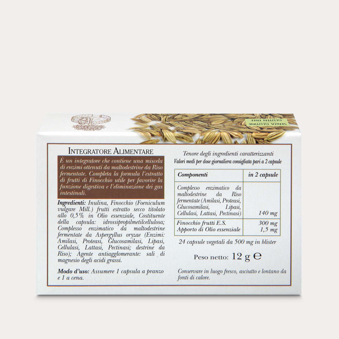 Erbamea ha formulato un integratore con un complesso enzimatico, ottenuto per fermentazione delle maltodestrine da Riso da parte del fungo Aspergyllus oryzae. In più, la formula di Enzimi è arricchita dalla presenza di un estratto secco di semi di Finocchio, dalle note proprietà carminative, utile per favorire l’eliminazione di gonfiori e gas addominali e le fisiologiche funzioni digestive.