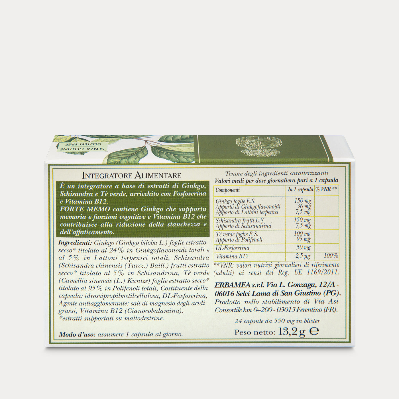 Erbamea propone un integratore che contiene Ginkgo, che supporta memoria e funzioni cognitive, e Schisandra ad attività tonico-adattogena. Completano la formula Acido pantotenico e Vitamina B12, che contribuiscono alla riduzione della stanchezza e dell'affaticamento, e L- Fosfoserina.