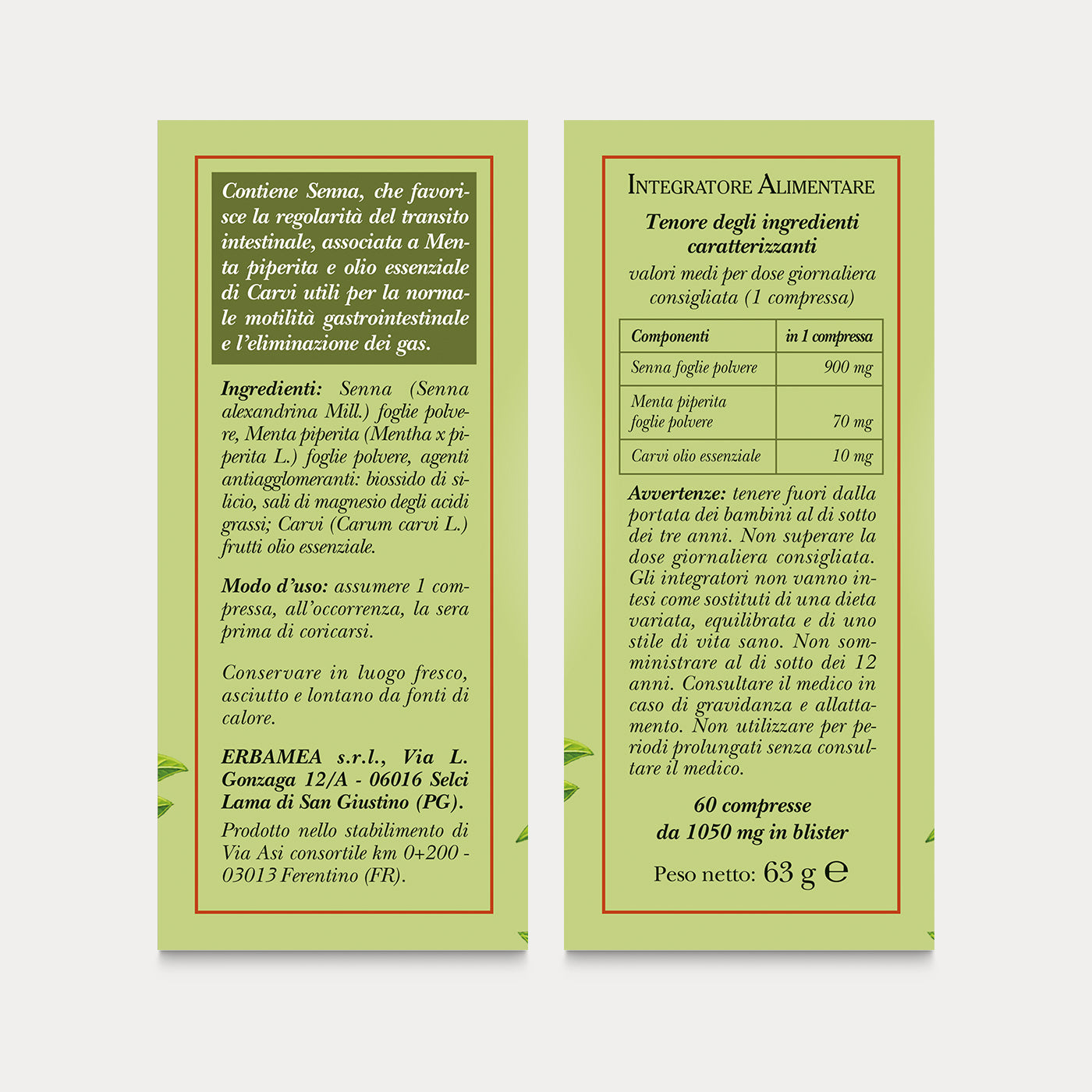 Abbinate a una dieta ricca di fibre, ad un giusto apporto di liquidi e ad un regolare esercizio fisico, queste compresse sono formulate con ingredienti dall’efficacia mirata a favorire la regolare funzionalità dell’intestino più pigro. Il prodotto contiene foglie di Senna che favoriscono la regolarità del transito intestinale, associate a foglie di Menta piperita e olio essenziale di Carvi, dalla specifica attività carminativa, utili per la normale motilità gastrointestinale intestinale e l’eliminazione dei gas.