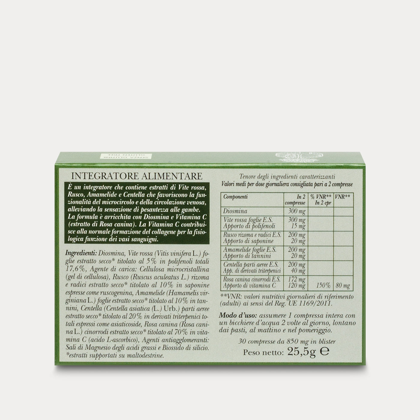 Un integratore che contiene estratti secchi titolati di Vite rossa, Amamelide, Centella e Rusco, che favoriscono la funzionalità del microcircolo e della circolazione venosa, alleviando la sensazione di pesantezza alle gambe, associati a Vitamina C (da Rosa canina) che contribuisce alla normale produzione di collagene per la fisiologica funzione dei vasi sanguigni. Arricchisce la formula il bioflavonoide Diosmina, ottenuto dall’Arancia.