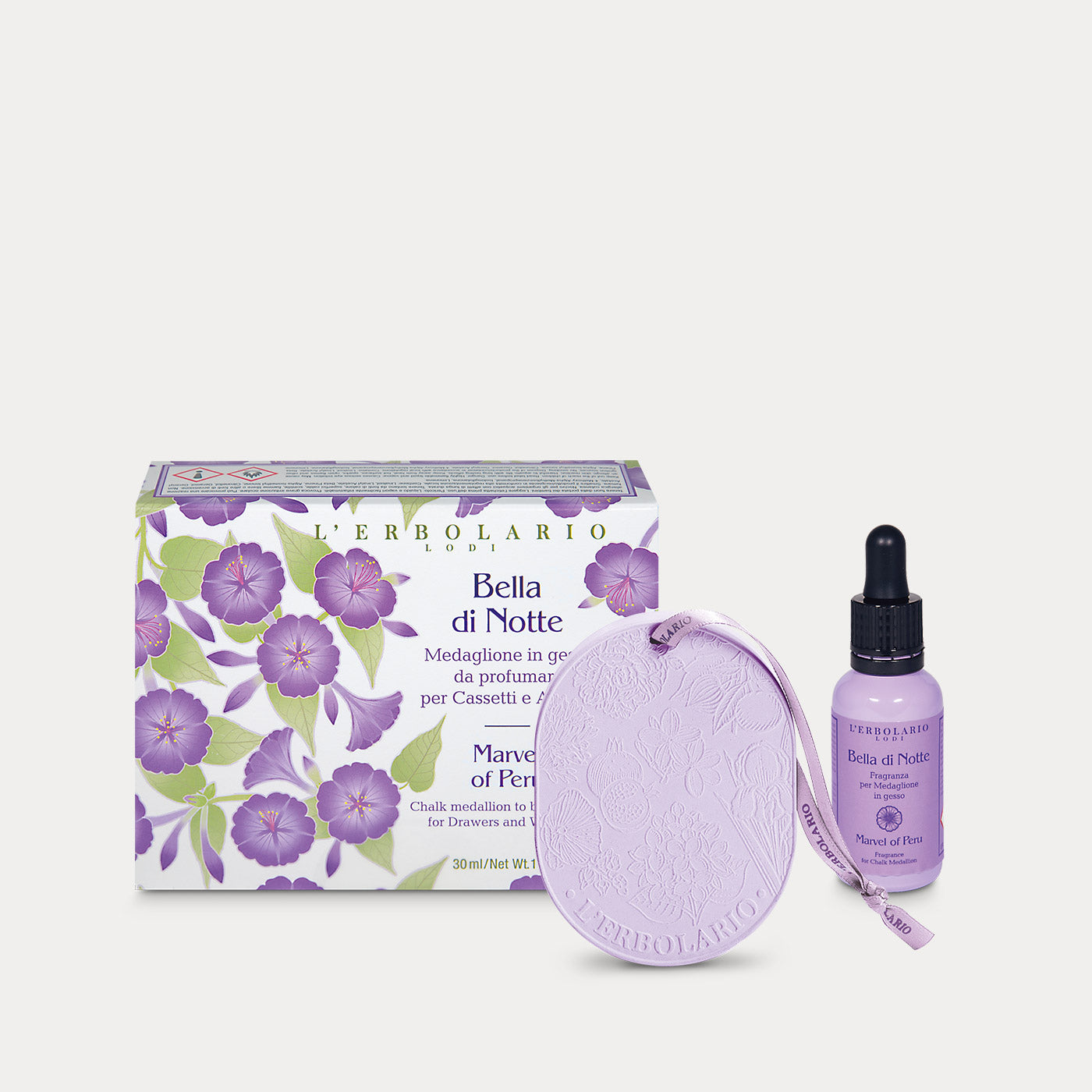 Questo kit comprende una fragranza per ambienti dotata di un comodo contagocce e un medaglione in gesso finemente decorato: basterà dosare qualche goccia del profumo fiorito e vanigliato sul medaglione in gesso e riporre quest’ultimo nei cassetti o negli armadi per profumarli.