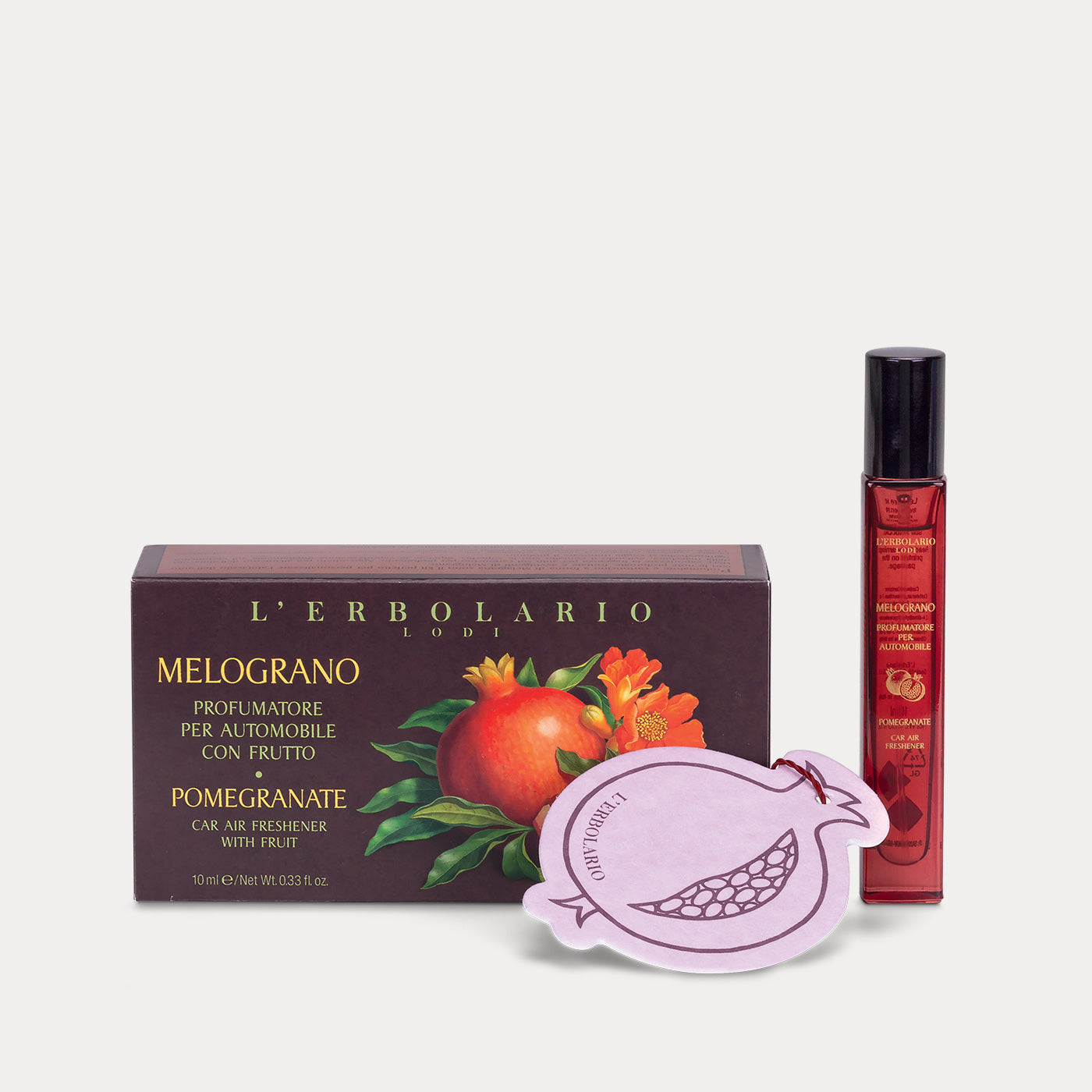 Profumatore e cartoncino a forma di Melagrana sono il kit perfetto per personalizzare l’abitacolo dell’auto con le note profumate, fruttate e avvolgenti di Melograno.