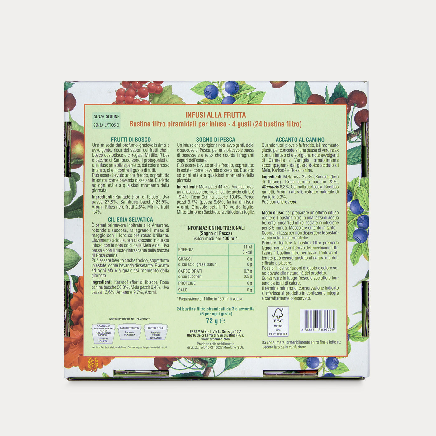 La confezione regalo contiene 24 bustine filtro monodose, 6 per ogni gusto (Frutti di Bosco, Ciliegia Selvatica, Sogno di Pesca, Accanto al Camino) per preparare tante tazze di infusi dal profumo gradevole ed intenso e dal gusto sempre diverso, da sorseggiare durante la giornata, dopo i pasti o alla sera per concedersi una piacevole pausa.