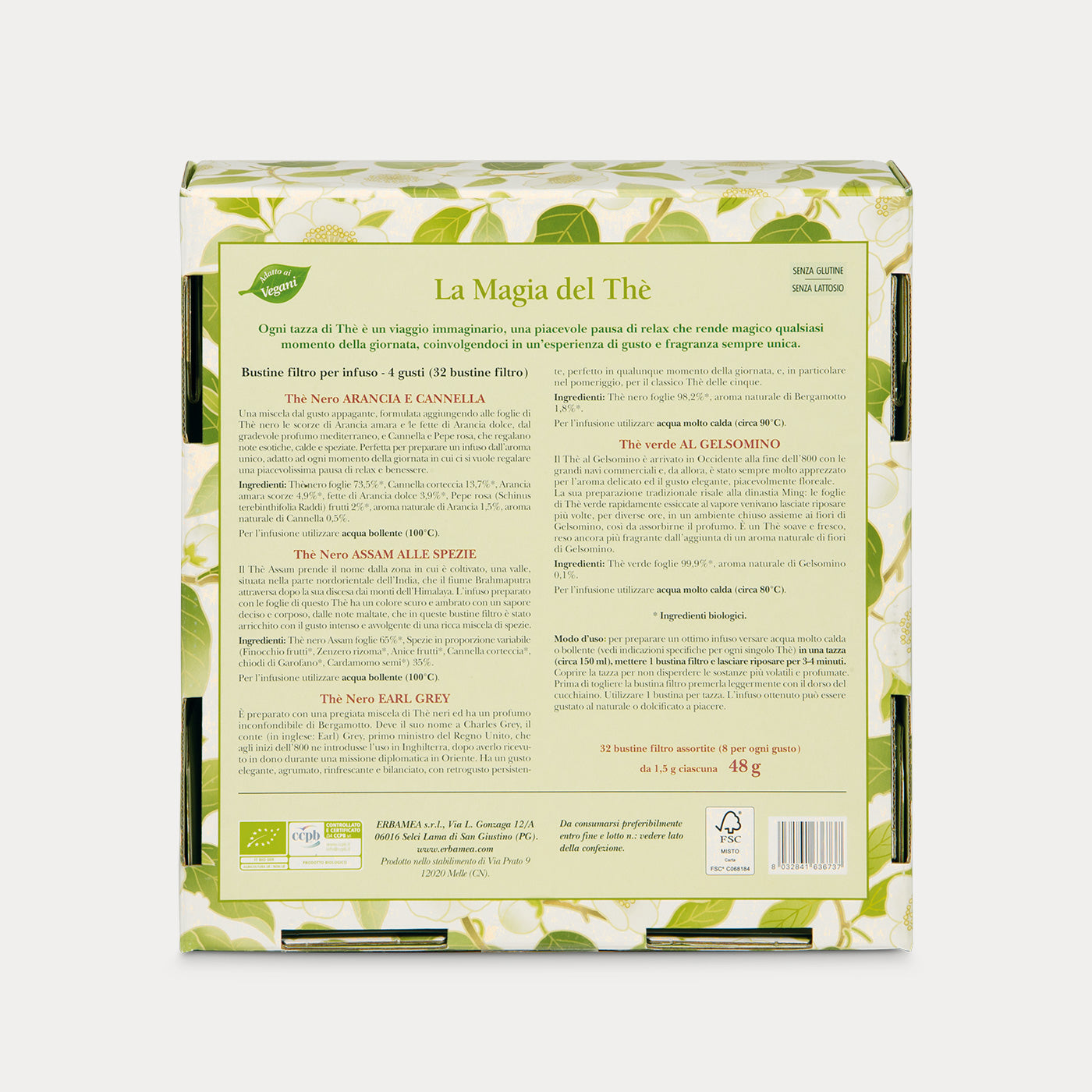 La confezione regalo contiene 32 bustine filtro, 8 per ogni gusto (Thè Nero Arancia e Cannella, Thè Nero Assam alle Spezie, Thè Nero Earl Grey, Thè Verde al Gelsomino).