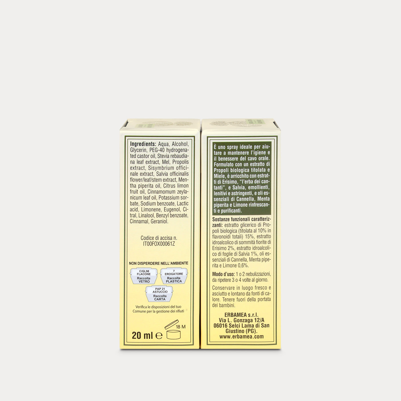 È uno spray ideale per aiutare a mantenere l’igiene e il benessere del cavo orale. Formulato con un estratto di Propoli biologica titolata e Miele, è arricchito con estratti di Erisimo, “l’erba dei cantanti”, e Salvia, emollienti, lenitivi e astringenti, e oli essenziali di Cannella, Menta piperita e Limone rinfrescanti e purificanti.